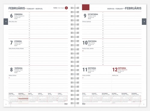 Apraksts: Visās A5 formāta dienasgrāmatās ir tabulas kalendārs, gada plāns, nedēļu numerācija, valsts svētku un atzīmējamās dienas, karogu dienas, vārda dienas, 38 citu valstu svētku dienas, norādīta pāreja uz vasaras un ziemas laiku, gadalaiku sākums, saullēkta un saulrieta laiki, mēness fāzes, zodiaka zīmju maiņas dienas, kontaktu un piezīmju lapas.