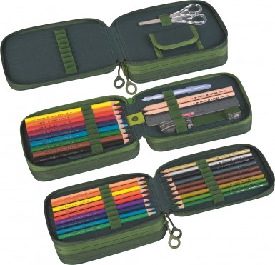 Komplektā ietilpst 18 plāni krāsainie zīmuļi, 9 biezi krāsainie zīmuļi, 2 parastie zīmuļi, lineāls 16cm, 2 dažādu diametru metāla zīmuļu asināmais, dzēšgumija, šķēres