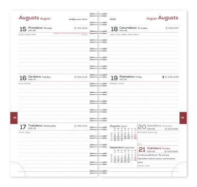 Papildinformācija: Mākslīgās ādas vāki ar nošūtu malu, ar spirāli, ar datumiem, perforēti noplēšami lapu stūrīši